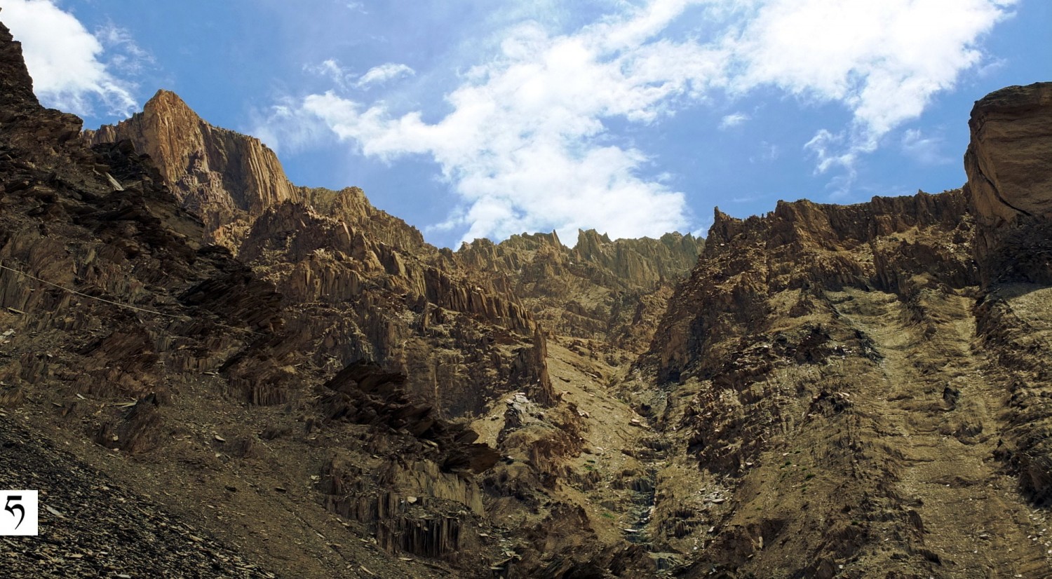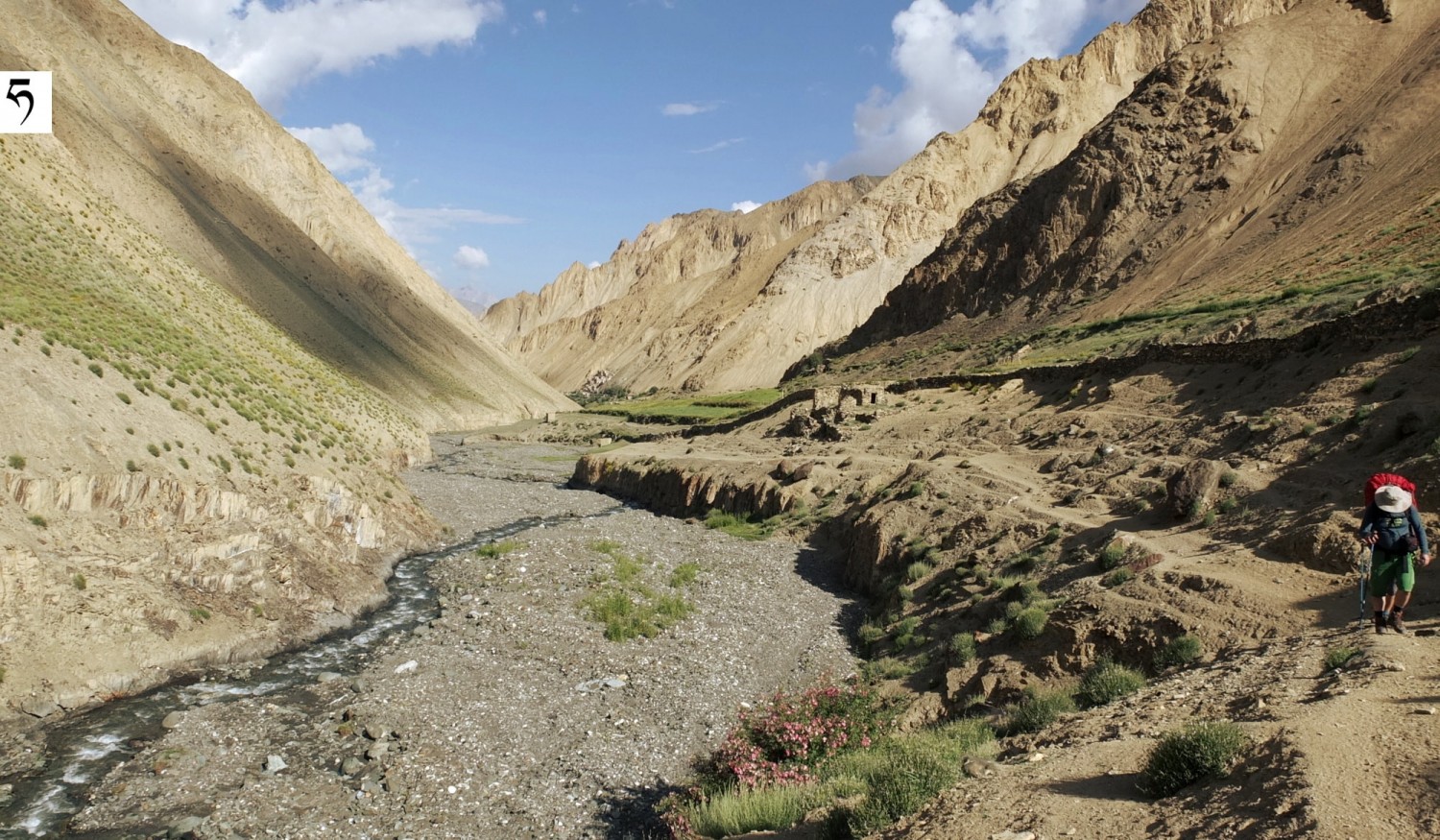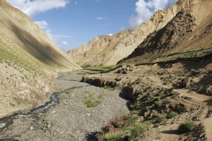 W dolinie Sumda Chu [ćhu] w drodze do osady Sumda. Po lewej na stoku widoczny zarys ścieżki używanej niegdyś podczas przyborów wody w korycie potoku.