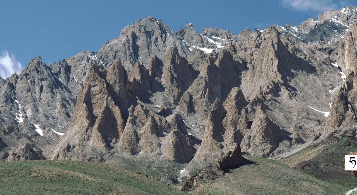 Skalne iglice nad pastwiskami w dolinie Sumda Chu [ćhu].