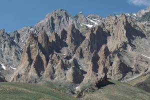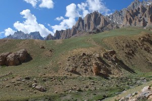Skalne iglice nad pastwiskami w dolinie Sumda Chu [ćhu].