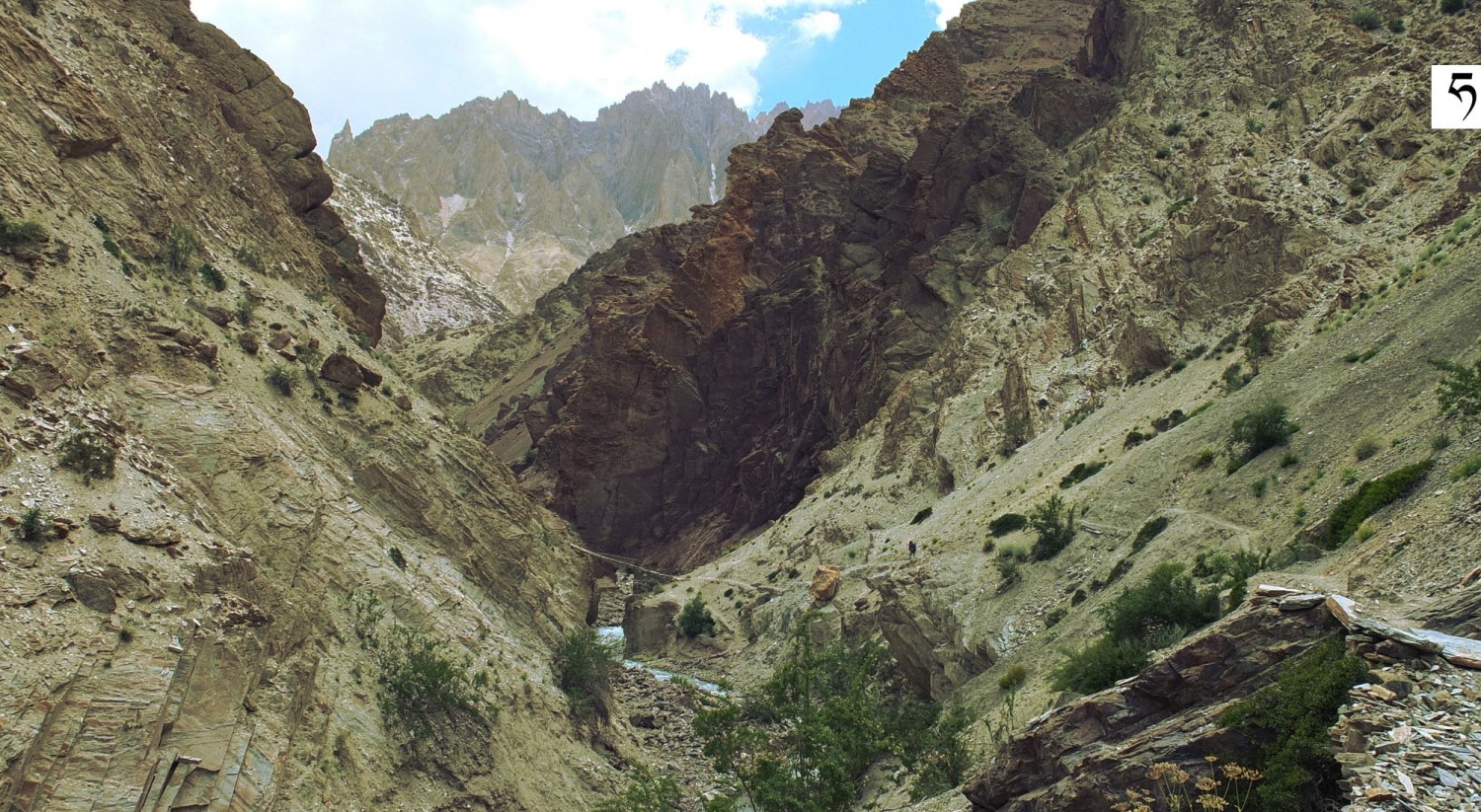 W dolinie Sumda Chu [ćhu] w drodze do osady Sumda. Po lewej na stoku widoczny zarys ścieżki używanej niegdyś podczas przyborów wody w korycie potoku.